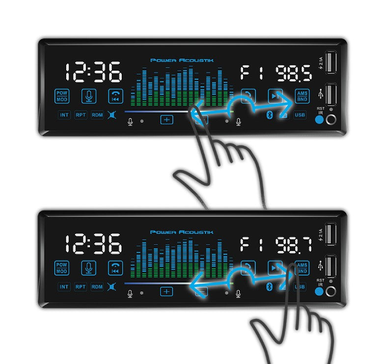 Cada radio Power Acoustik incorpora un amplificador de audio de circuito integrado de clase A/B. Su potencia máxima de 75 vatios es suficiente para la mayoría de los altavoces de fábrica de los coches. Las opciones de configuración del sonido incluyen balance, atenuación y ajuste de graves y agudos.