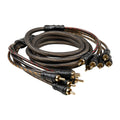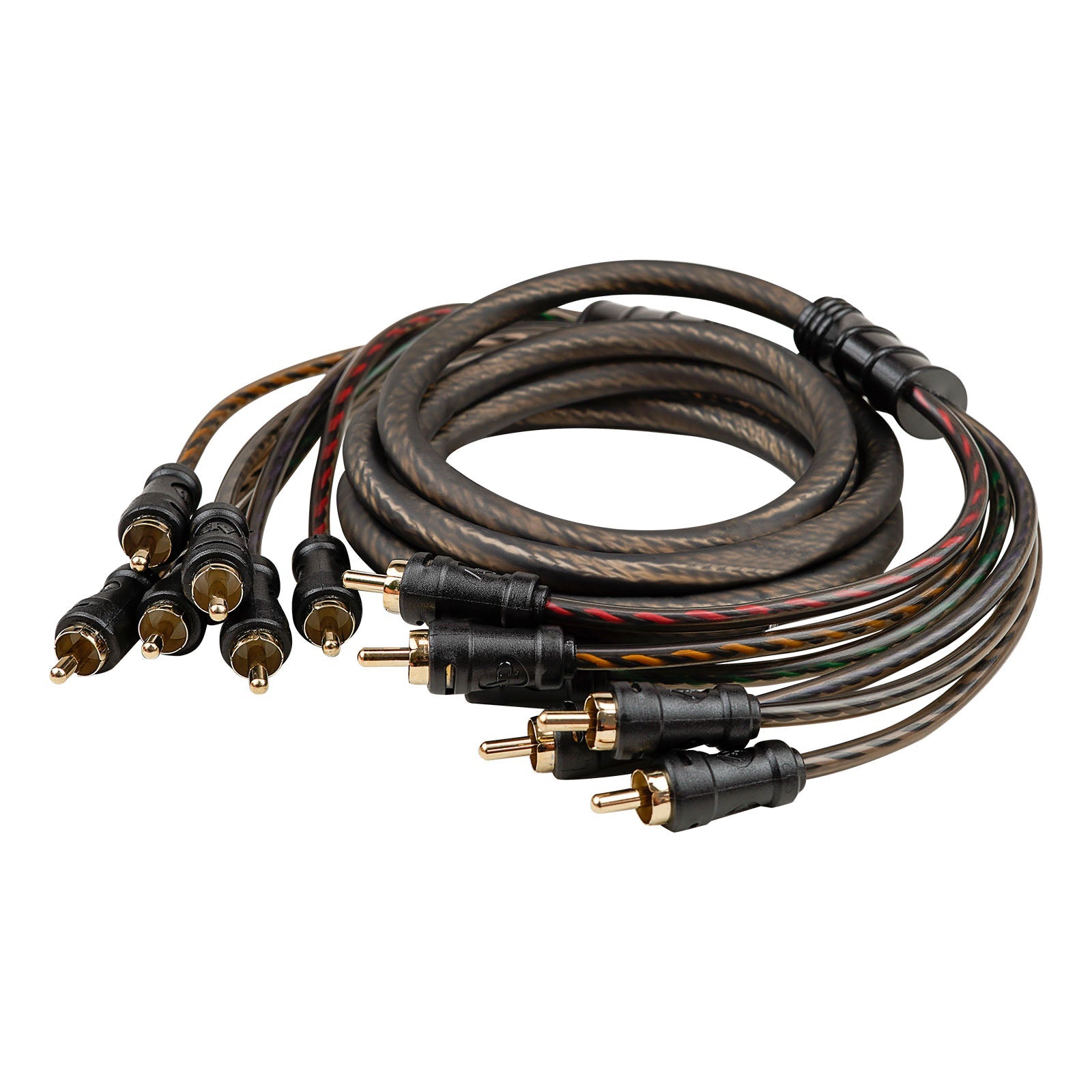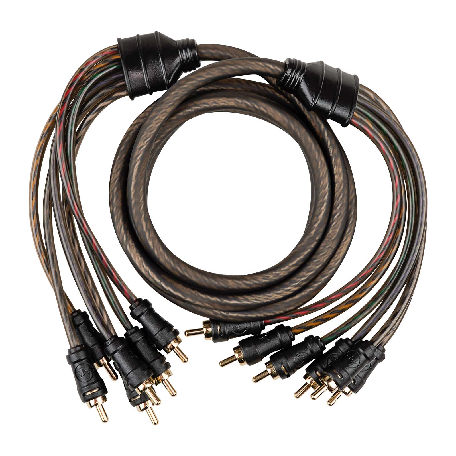 The 6-Channel Interconnect Cable for Car Audio features OFC conductors, a frost gray jacket, and dual injection nickel-plated split RCA ends, all enhanced with dual Twisted Pair Hyper-Flex technology for superior signal transfer and improved frequency response.