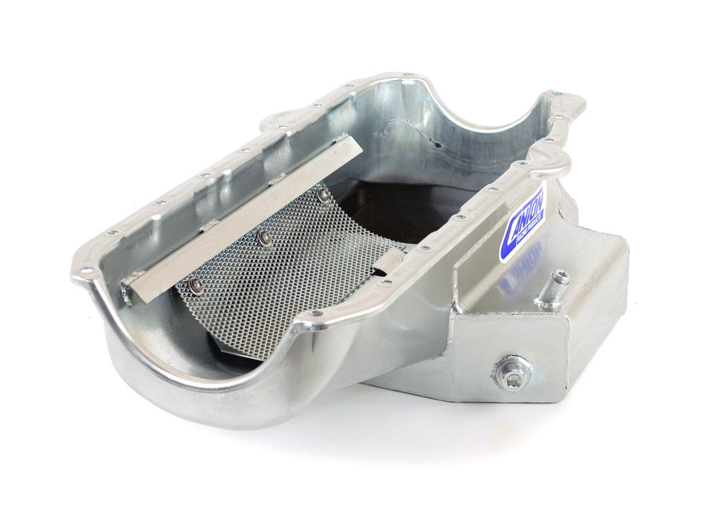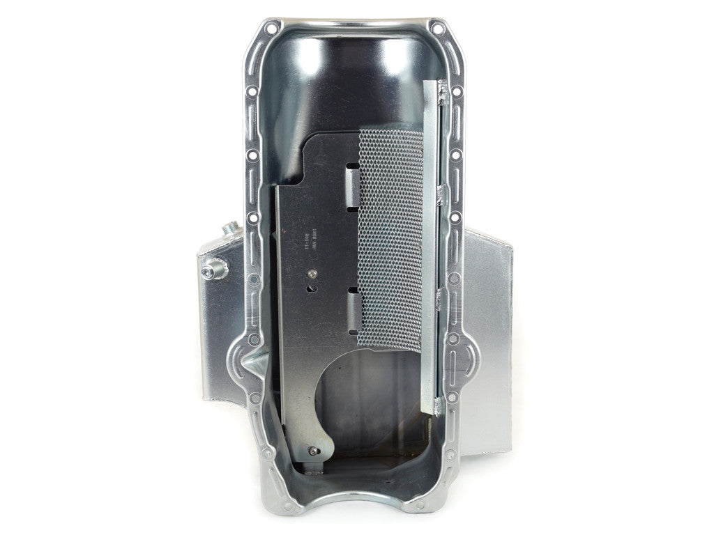 This Competition wet sump is for pre-'80 Small Block Chevys with left side dipstick. It is designed for applications where the engine is set extra low in the chassis. Fits front steer chassis with both aftermarket and Camaro front ends. The pan has a 6-1/2" deep, 15" wide, 12" long sump, and a 7 quart system capacity. Requires one of our pickups.