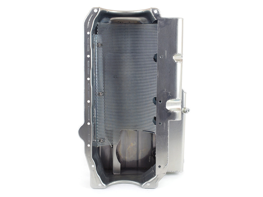 This open chassis shallow "L" style steel wet sump is for pre-85 Small Block Chevys. The pan is designed for applications requiring extra ground clearance and with chassis without any x-members under the engine (asphalt and dirt modifieds, sprint cars, and some late models). It has a 16" long, 6-1/2" deep L sump with an 8 quart system capacity. Requires one of our pickups. Also an available option for this pan is #20-914 Pro Louvered Windage Tray, designed to replace the standard screen tray in this pan.
