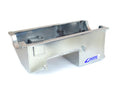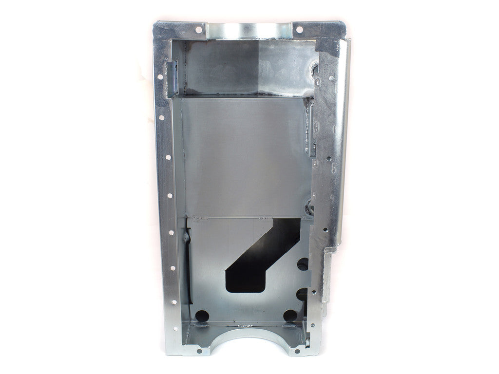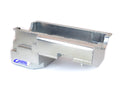 This Fox body drag race pro-style power pan is for 351W with 2 or 4 bolt rear main caps & 164 or 157 tooth flywheel applications. It has a 9" deep rear sump and a 7 qt. system capacity. Designed to work with our one-way screen windage trays, which mount directly to the main caps studs. The large oil recovery pouch requires the right side mounting bolts to be accessed through plugs in the bottom of the pan. Works with long tube headers & late model stock starter.
