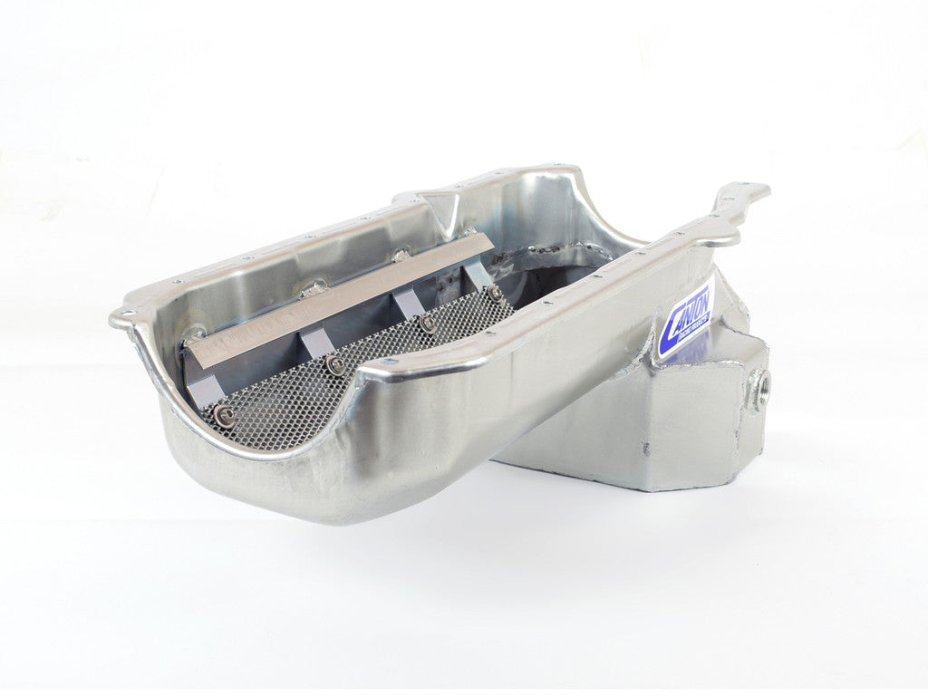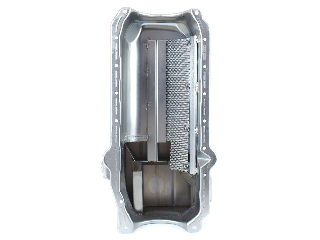 This road race pan is for '85-up SBC blocks in '82-'92 F-Bodies. It has a 7-1/2" deep, 12" wide, 8-1/4" long sump for a 6 qt. system capacity. Will work with stock starter. This pan requires one of our pickups.