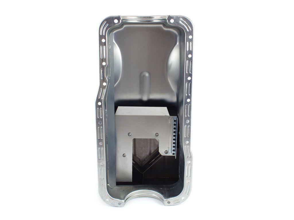 This front sump road race pan is for Ford 289-302. It has a 8 qt. system capacity, 8" deep, 12" wide, 10-1/2" long, 14 ga. sump designed for Cobra kit cars. Will work with stock & aftermarket starters. This pan requires our 15-611 pickup and for use with a Melling M68 oil pump.