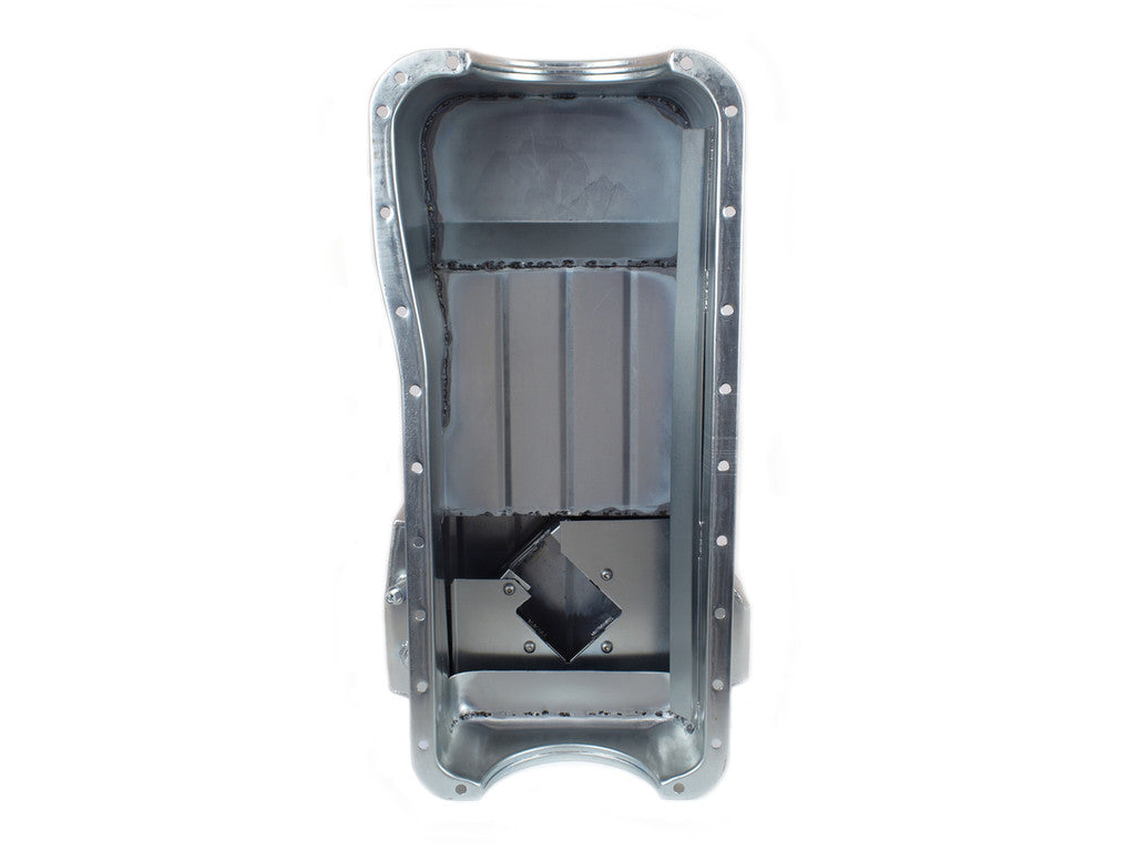 This "T" style rear sump road race baffled oil pan is designed for Ford 429-460 engines in "79 and up Mustangs and other rear sump applications, such as Cobra Kits. It has a 7-1/2" deep by 8" long by 13-1/2" wide sump with a 7 quart system capacity. This pan requires our 15-775 pickup & M84DHV Oil pump.