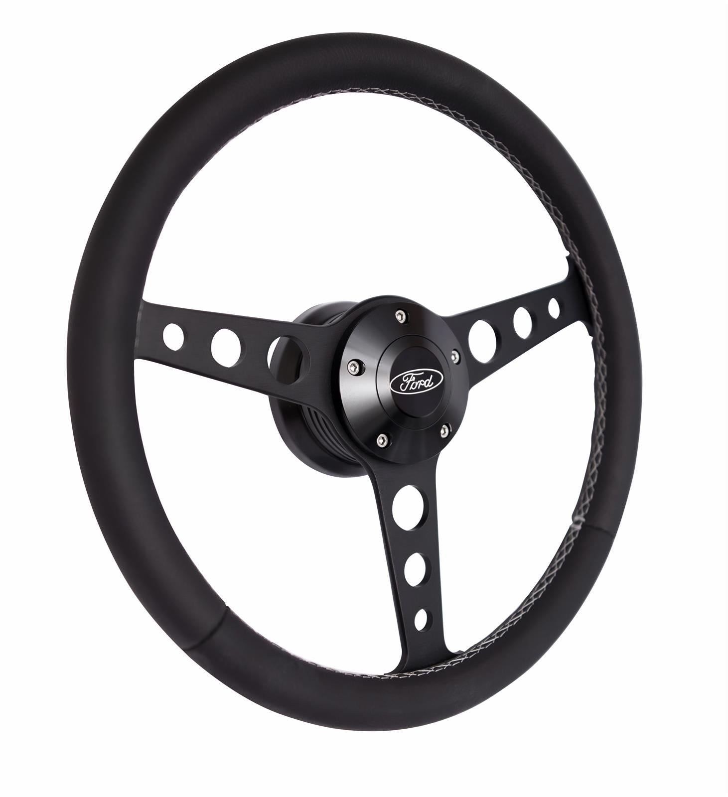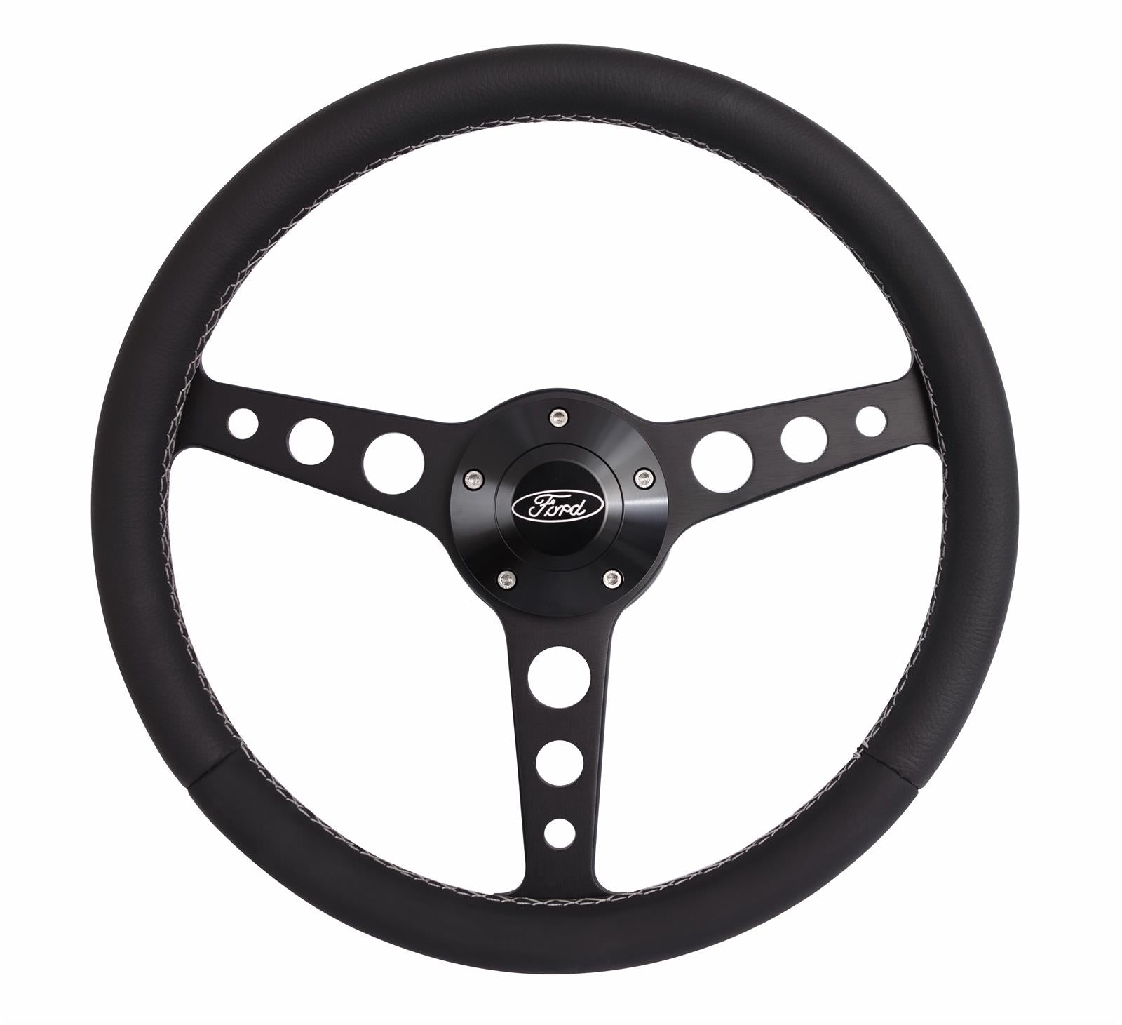 Steering Wheel, Billet Classic Series, Billet Aluminum, Black, Leather/Black, 3-Spoke, 14 in. Diameter, 5-Bolt mount, Ford Logo Horn Button, Each