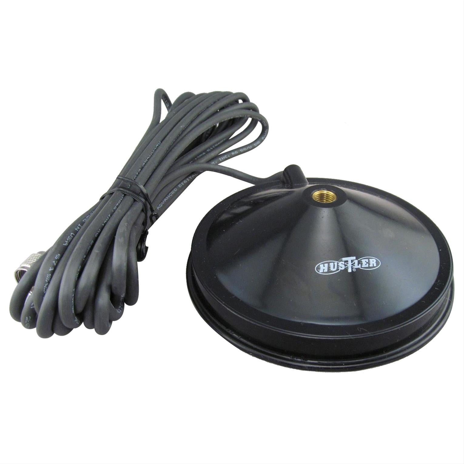 Hustler Super Magnetic Mounts exert an impressive 95 lbs. of pull strength! These powerful magnetic bases have a 5 in. diameter magnet complete with over 16 ft. of quality RG-58 coax terminated with a PL-259 (UHF male) connector. Hustler recommends these bases for tall antennas with standard 3/8-24 threaded bases.