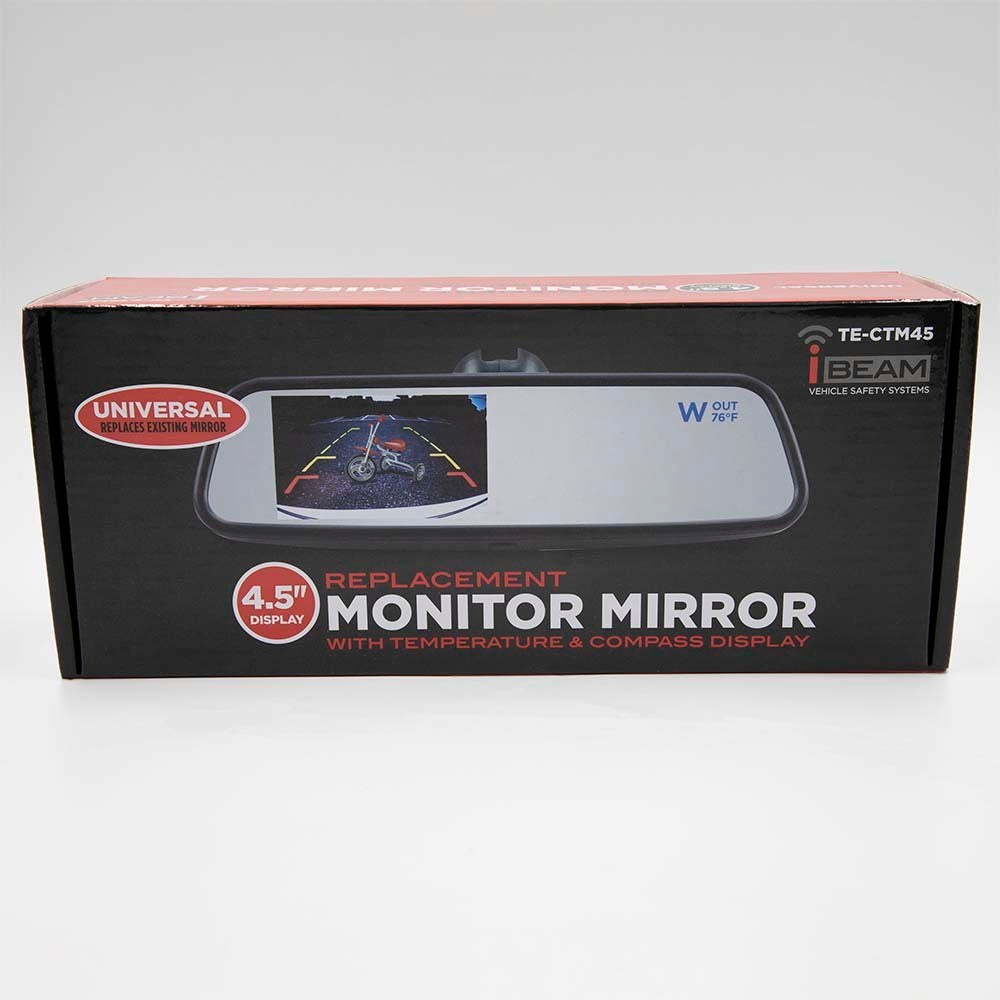 Our iBeam 4.5 inch mirror monitor replaces your vehicles factory rear-view mirror with a full color LCD screen and mirror in one! Connect up to two video inputs – rear-view camera and a second camera feed to give drivers a panoramic view while also providing temperature and directional information in an intuitive location. Display is virtually undetectable when switched off revealing a flawless factory-quality mirror. Includes our most widely used windshield mount – with additional options sold separately.