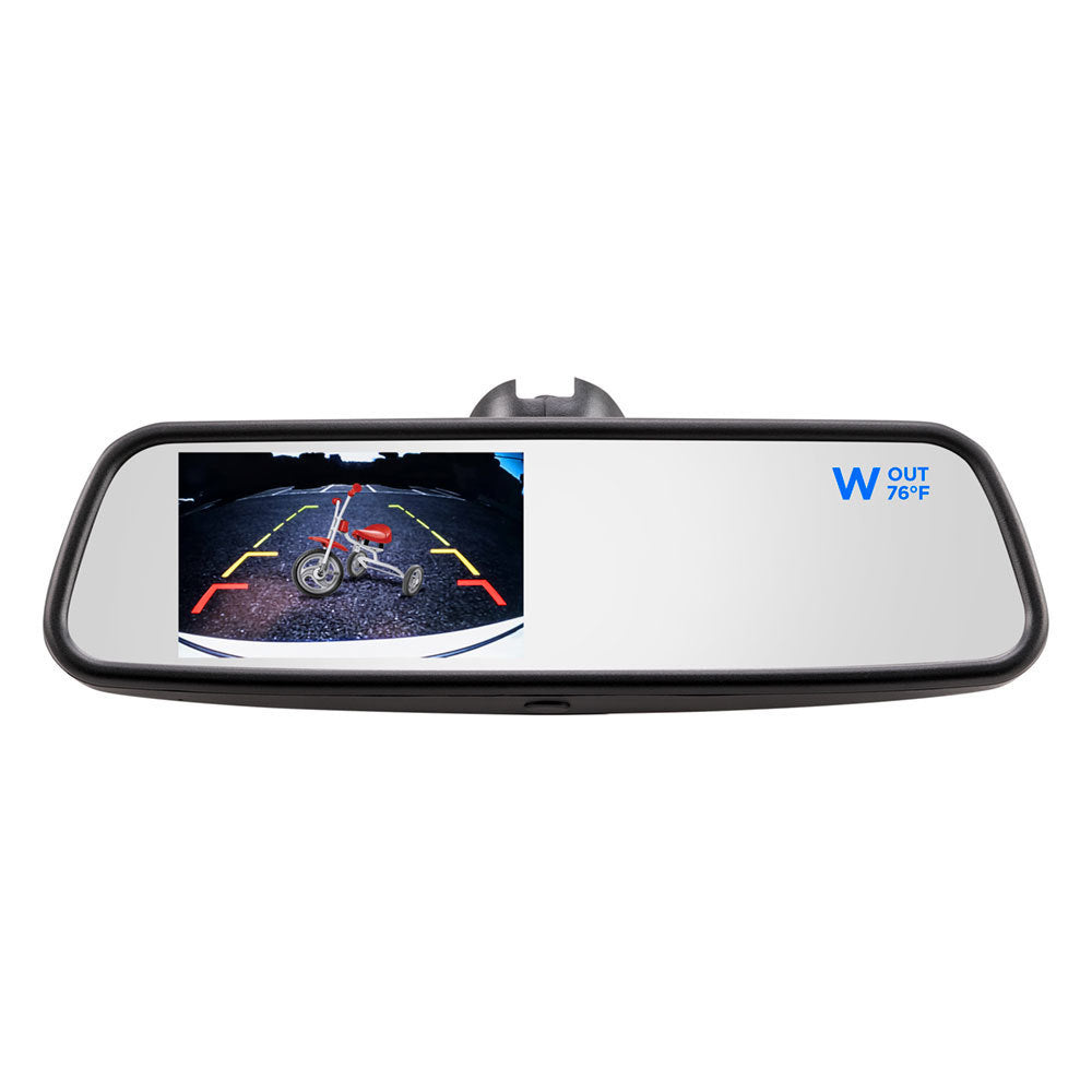 Integrate your vehicles safety camera display into your rear-view mirror while conveniently viewing outside temperature and driving direction with this 4.5 inch mirror monitor.