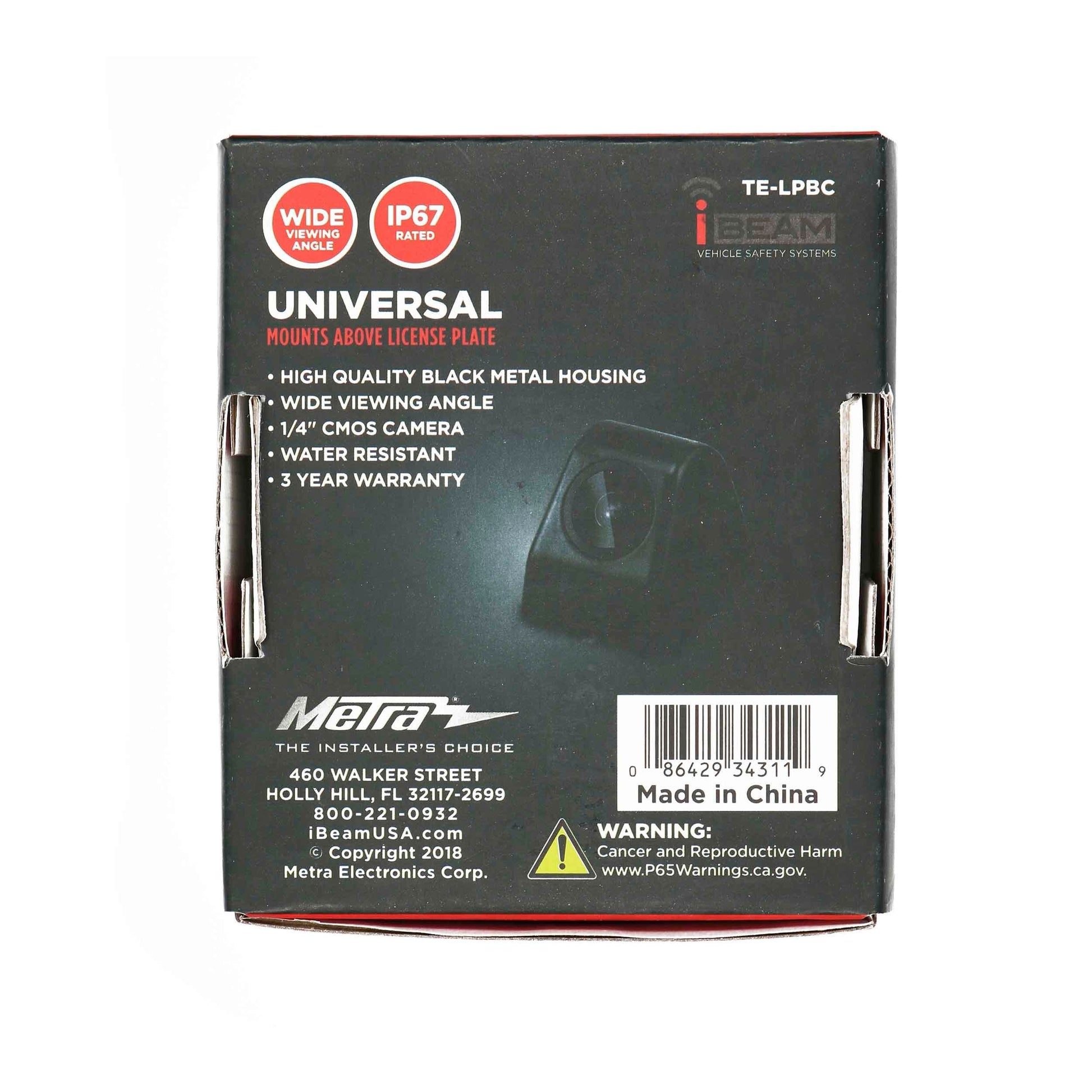 iBeams Above License Plate Backup Camera installs easily above rear license plates to help increase parking accuracy and avoid obstacles when reversing. It is a universal fit for any vehicle. The water resistant and high quality metal housing in gloss black provides a sleek look that will withstand the elements. The 1/4 inch CMOS camera provides a sharp picture with a 110 degree angle view and 0.6 lux night vision. The camera helps drivers to gauge the trajectory of their car when reversing into tight spaces and improves their awareness of surroundings that would otherwise be unseen. Also available in gloss black (TE-LPGC) or chrome (TE-LPCC).