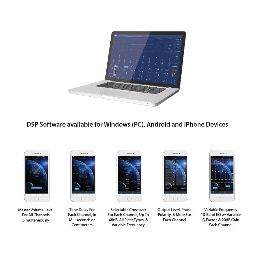 For those who want the most out of their car audio system, quality sound processing is necessary. Razor DSP amplifiers offer similar sound processing options by including the functions of a Digital Sound Processor. Adjusting the DSP is easy, using an intuitive user interface. After some slight adjustments, your system can sound like audio professionals have tuned it. Connection to the DSP module is possible via USB connection to personal computers or Bluetooth to an available Android & iOS device App. Unlock the best from any system with Razor DSP amplifiers.